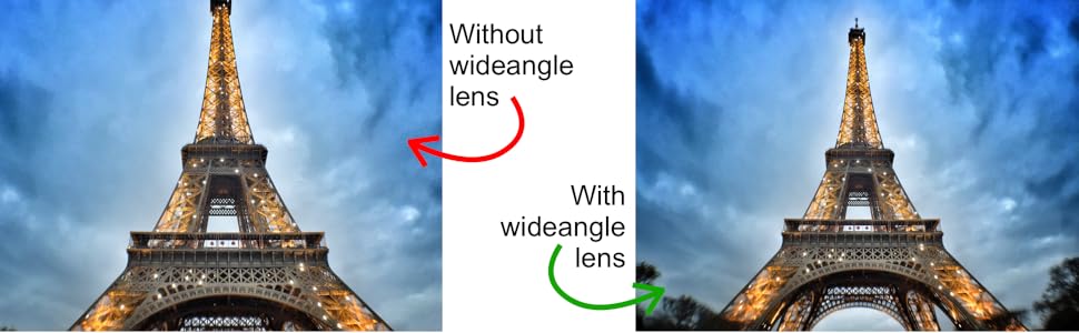 The wideangle lens (on left) adds a bit of breadth to your images. Giving you approximately 20% more picture to your camera. You’ll mainly notice it when you take a before/after picture.