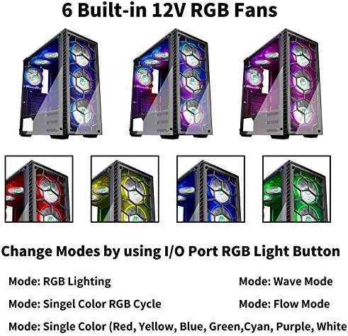 [POWERFUL COOLING SYSTEM]–6*120mm RGB LED fans Pre-installed in this gaming computer case: 3 x Front , 1 x Rear, 2 x Top;up to 160 mm long liquid-cooling radiator on front(optional). You can change the color and mode of the light through the RGB button.