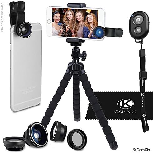 CamKix Flexible Tripod, Bluetooth Remote and 5in1 Lens Kit This kit will firmly hold your phone in any position, allowing you to take amazing pictures or record awesome videos wirelessly! Where other tripods fail, this tripod will get the job done. Twist the legs of the tripod in any position to place it anywhere. Wrap it onto a pole or branch, hang it on a fence, place it on an uneven surface, etc. The Bluetooth remote control is perfect for taking selfies or group shots (including the photographer) from a distance of up to 30 feet (10 m). You only need to pair the remote control with your smartphone once. Then choose the camera app you want to use and press the button of the remote control to capture that awesome picture! Awesome mobile photography for back or front facing cameras. Includes 5 quick connect lenses: telephoto lens, circular polarizer lens (CPL), fisheye lens, macro lens and wide angle lens. Combine with your favorite apps to share photos instantly. The universal phone holder connects in landscape or portrait mode and can hold phones with a width between 2.24″ (5.7 cm) and 3.18″ (8.1 cm). Contents: – 1x Flexible Tripod – 1x Bluetooth Remote Control – 1x Circular Polarized Lens (CPL) – 1x Telephoto Lens – 1x Wide Angle and Macro Lens – 1x Fish Eye Lens – 1x Lens Clip – 1x Universal Phone Holder – 1x Cleaning cloth CamKix If for any reason you are unhappy with any product by CamKix, please do not hesitate to contact us. We take full ownership and responsibility for the quality of our products and will do our very best to solve your problem quickly and efficiently! CamKix-USPTO# 86127507- is a registered trademark protected by US Trademark Law. CamKix products are sold by authorized sellers only.