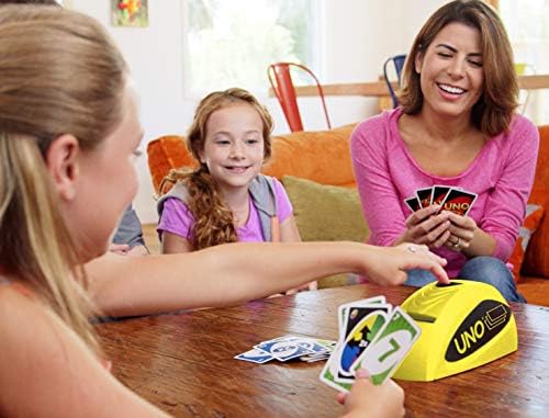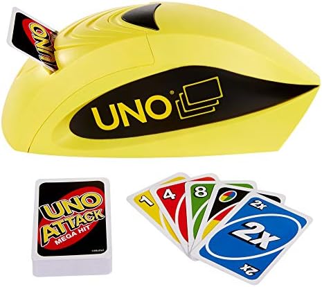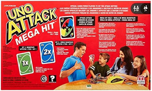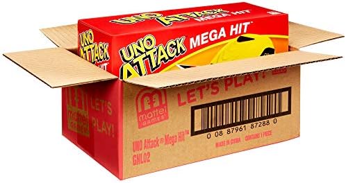 It’s the matching game you know, but with an exciting twist! UNO AttackTM Mega Hit has an electronic random card shooter with an exclusive sleek design that adds an unpredictable element to each game! As you race to match the cards in your hand with the current card shown on top of the deck, attack cards determine how many times you have to press the card launcher button and watch out for shooting cards! When you’re down to one card, don’t forget to yell “UNO!
